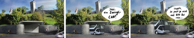 Erst dann kann man, sofern die Parkhausbauer bei ihrer Aussage betreffend eines schonenden Ausbruchs bleiben, mit dem eigentlichen Vortrieb beginnen: Das bedeutet einen Abtransport von ungefähr 500‘000 Tonnen Felsausbruch, d.h. während 3 bis 4 Jahren mindestens 25‘000 Fuhren per 3-Achser hin und 25‘000 Fuhren zurück in eine bisher unbekannte Deponie und dazu erst noch tägliche Zulieferungen von Baumaterialien, Maschinen, Geräten, usw., sowie den restlichen Baustellenverkehr via die ganze Stadt. Bis anhin waren die Angaben zur Dauer der Bauarbeiten unterschiedlich: zuerst sprach die Bauherrschaft von 6 bis 8 Jahren, dann Anfang 2016 nennen sie noch 4 Jahre Bauarbeiten (2018 bis 2022). Aber wenn wir die Menge des auszubrechenden Felsens anschauen, dürfte dieser Ausbruch wohl alleine 4 Jahre dauern.